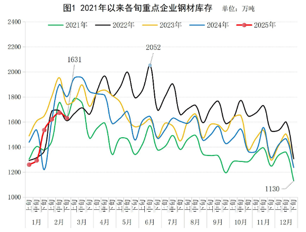 2025年2月下旬,重點(diǎn)統(tǒng)計(jì)鋼鐵企業(yè)(以下簡(jiǎn)稱(chēng)“重點(diǎn)企業(yè)”)鋼材庫(kù)存量1631萬(wàn)噸,環(huán)比上一旬減少42萬(wàn)噸,下降2.5%;比年初增加394萬(wàn)噸,增長(zhǎng)31.9%;比上月同旬增加96萬(wàn)噸,增長(zhǎng)6.3%;比去年同旬減少171萬(wàn)噸,下降9.5%,比前年同旬減少111萬(wàn)噸,下降6.4%(見(jiàn)圖1)。
